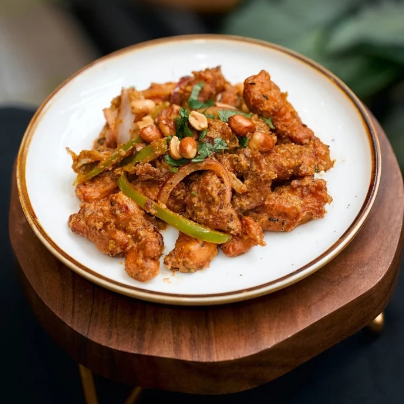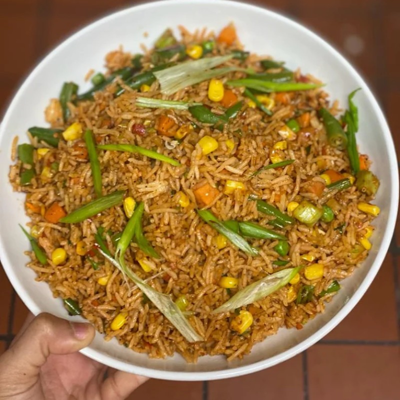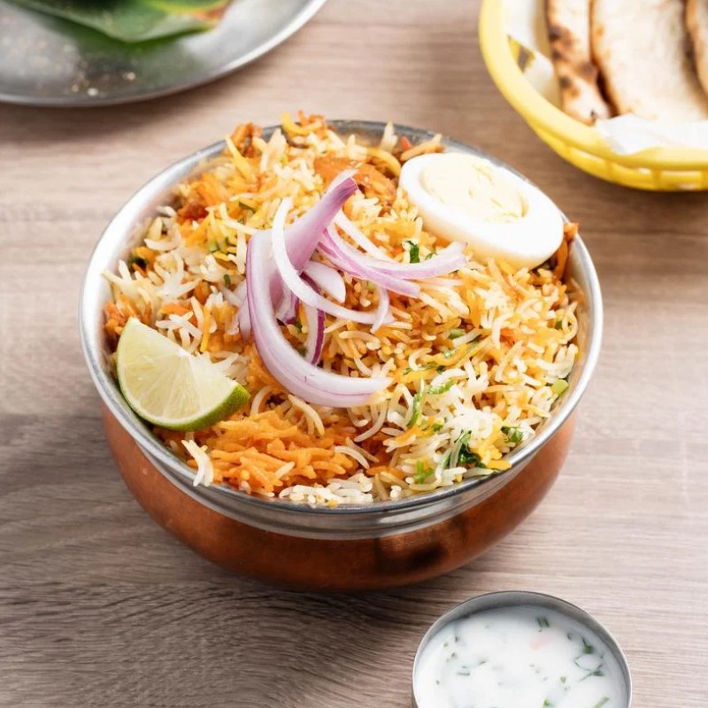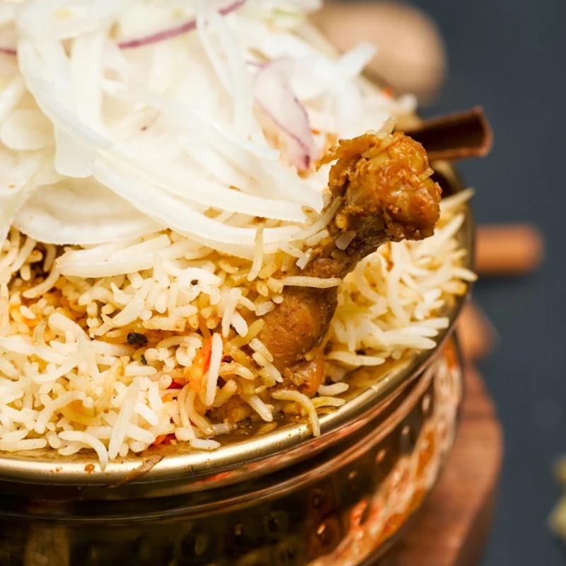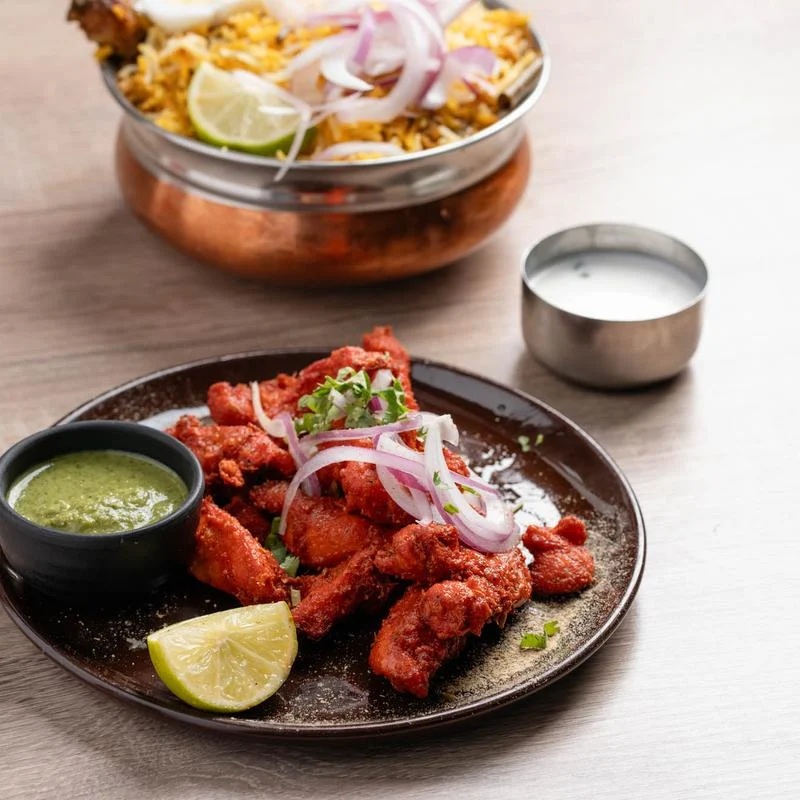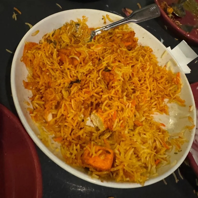 Indian flavored rice cooked with aromatic spices and served with indian spices marinated fried chicken