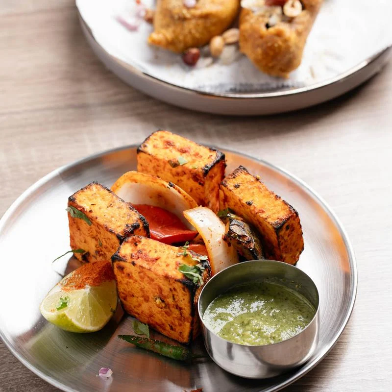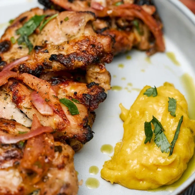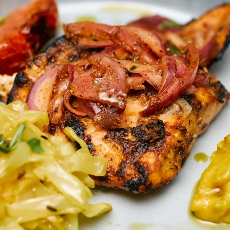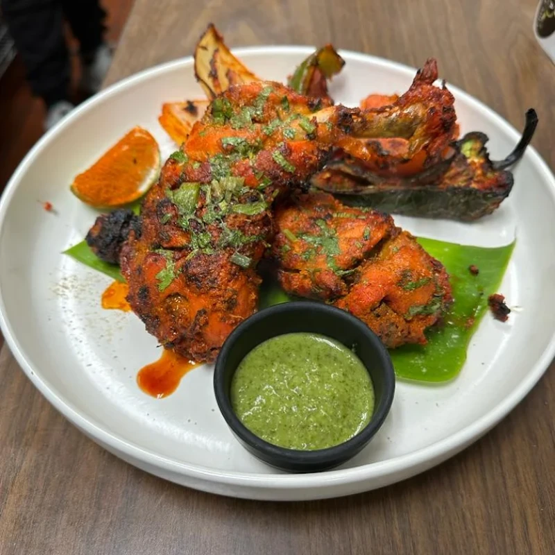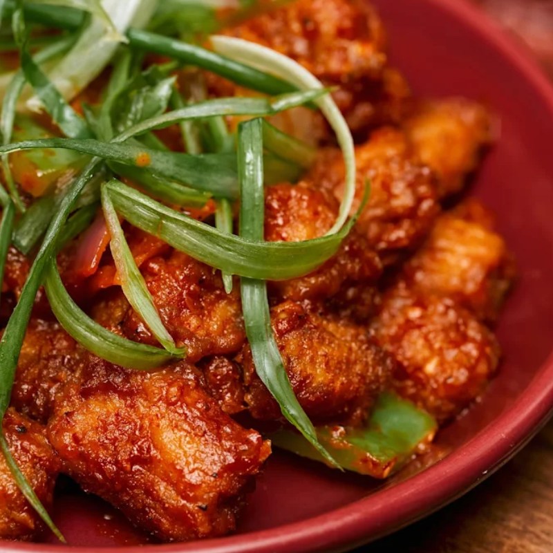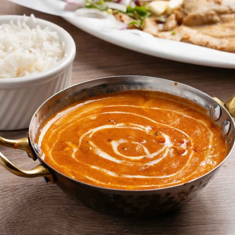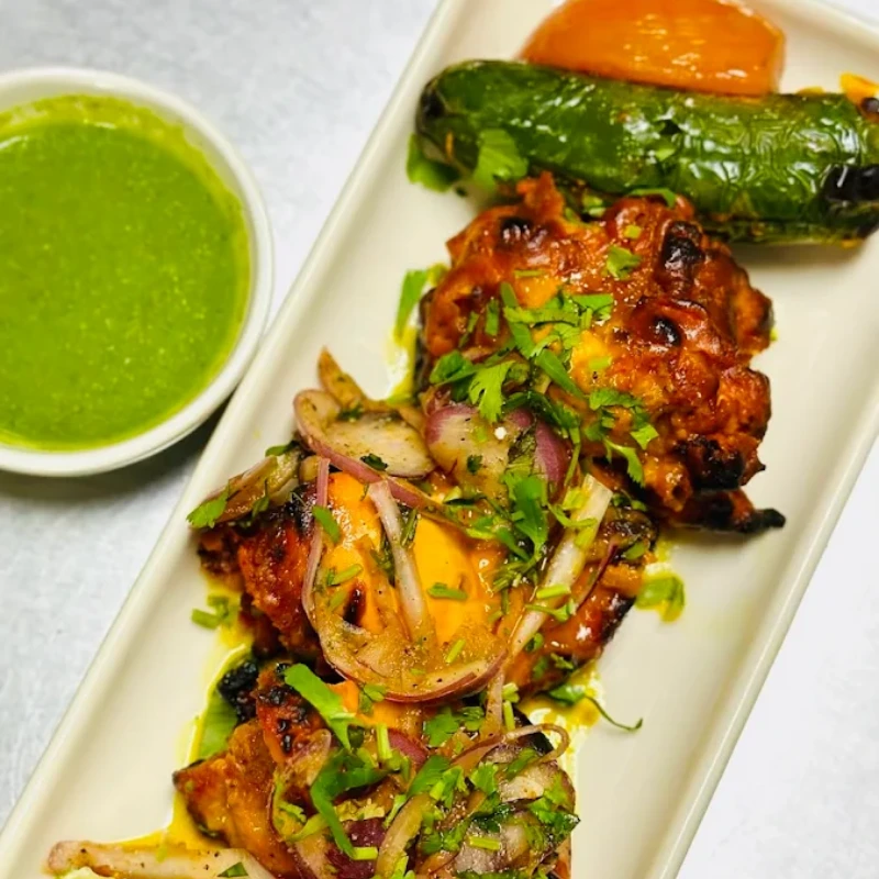 Indian flavored rice cooked with aromatic spices and served with indian spices marinated fried chicken